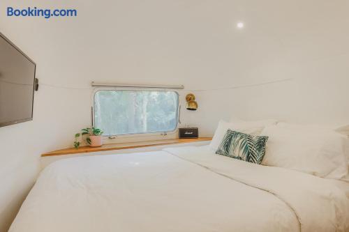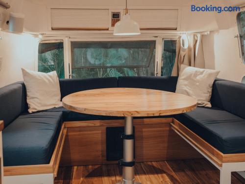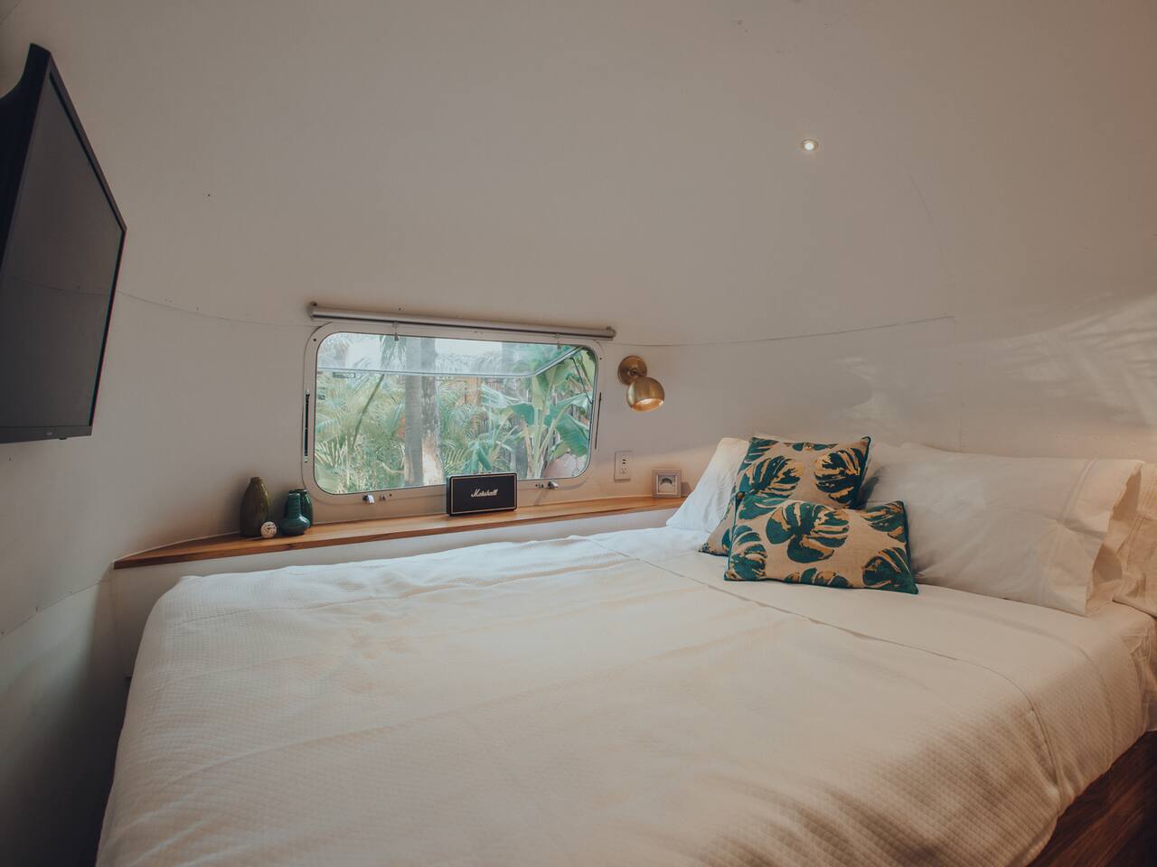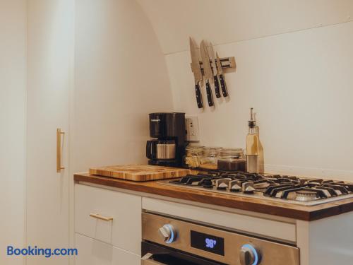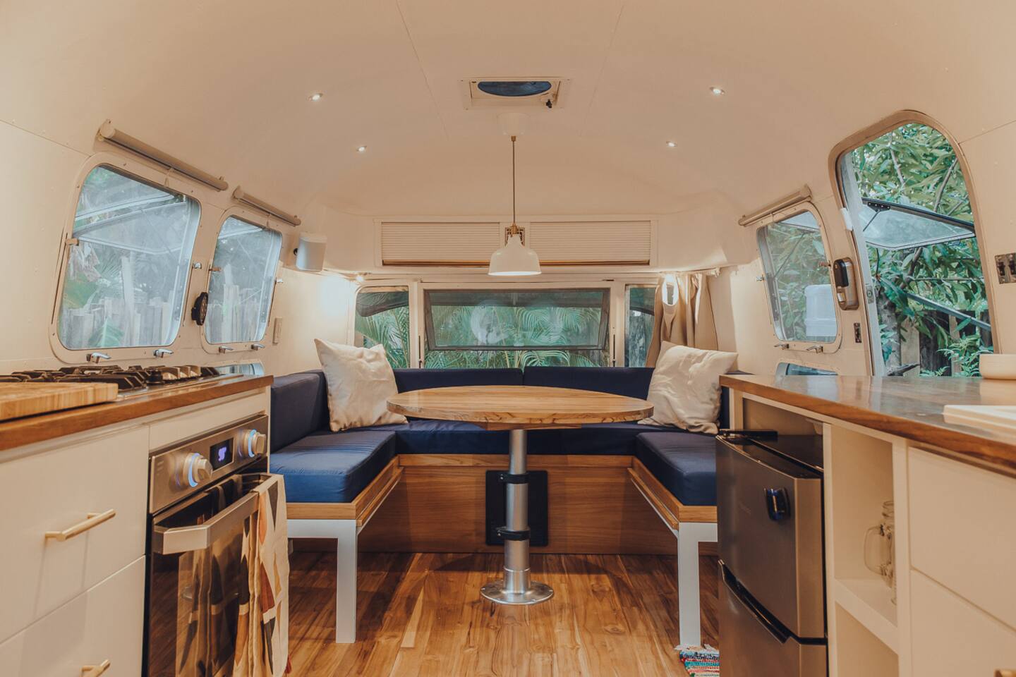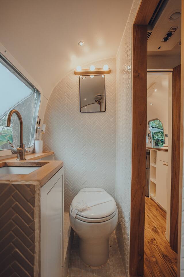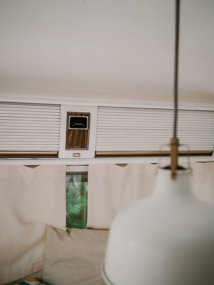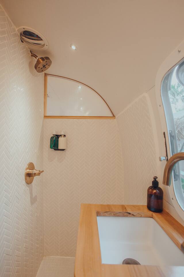Our 31ft 1973 Airstream is designed for comfort and style with: - Queen bed, high-quality linens - Indoor bathroom with hot shower - Air-conditioning, high-speed Wi-Fi - Mini-kitchen, flatscreen TV, Sonos speakers - Private outdoor deck and hot shower - Communal fire pit and ping pong table