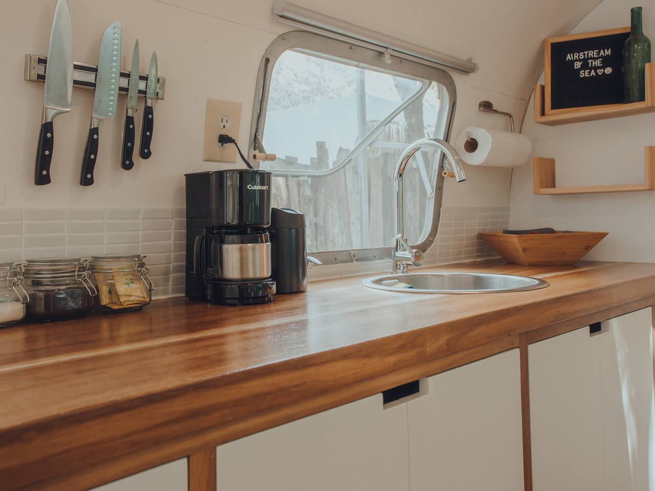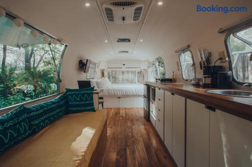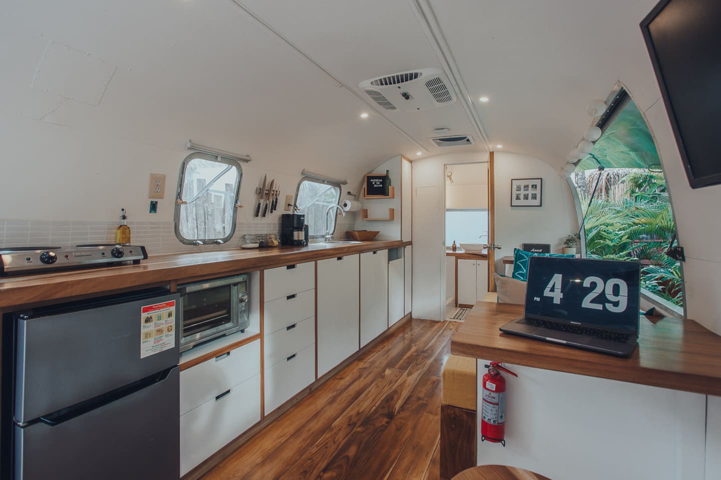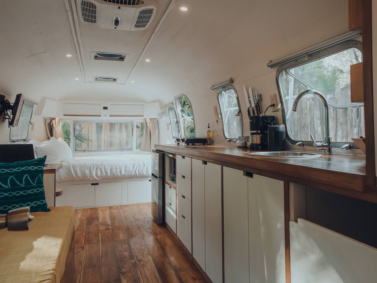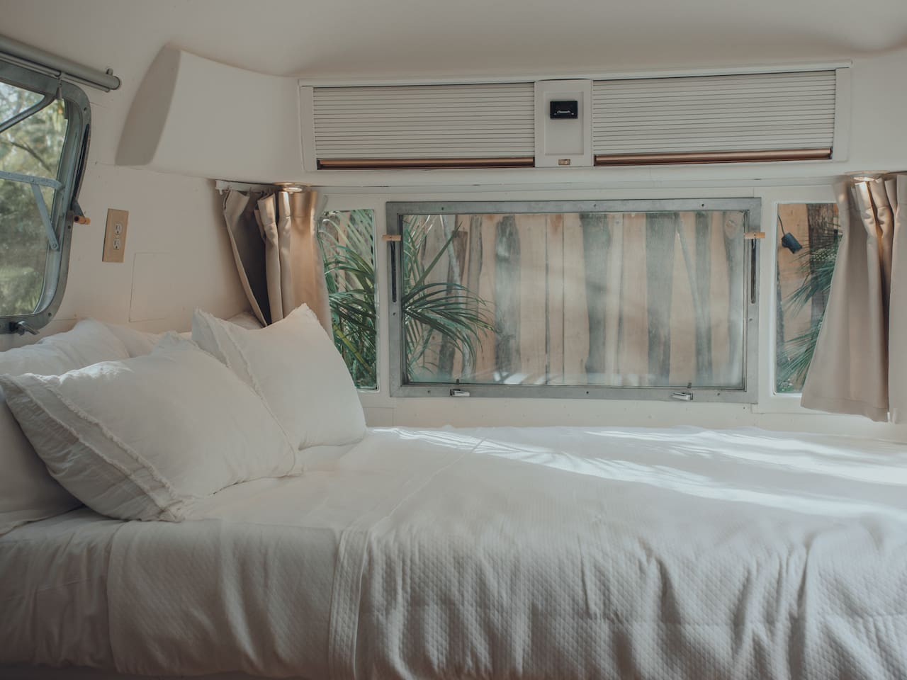 Our 29ft 1978 Airstream is designed for comfort and style with: - Queen bed, fresh linens - Indoor bathroom with hot shower - Air-conditioning, high-speed Wi-Fi - Mini-kitchen, flatscreen TV, Marshall speaker - Private outdoor deck and hot shower - Shared fire pit and ping pong table